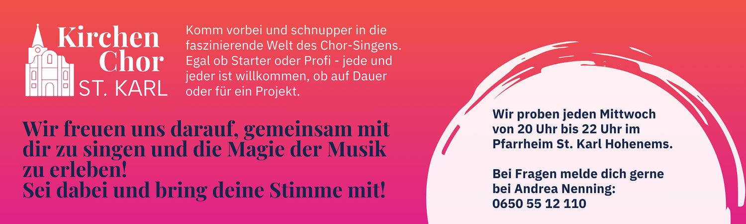 Jeden Mittwoch proben wir um 20.00 Uhr im Pfarrheim St. Karl. Unsere feststehenden Choreinsätze sind die kirchlichen Hochfeste, wie Weihnachten, Hl. Drei Könige, Ostern und Pfingsten. Ebenso Christi Himmelfahrt und Fronleichnam sowie diverse Sonntagsmessen im Jahreskreis.